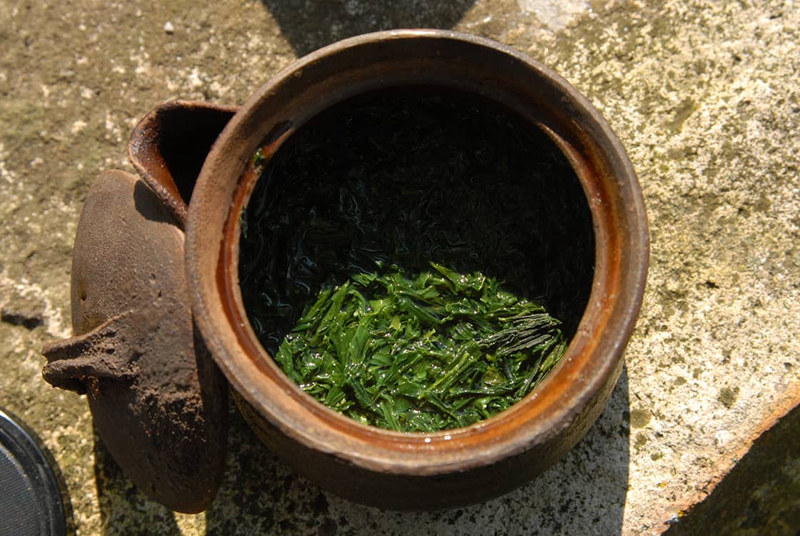 A differenza di altre regioni, gli agricoltori non tagliano o sostituiscono gli arbusti morti. Al contrario, potano e ripiantano. Da qui l’imponente apparato radicale. La neve abbondante ha insegnato agli alberi la resilienza e il letargo. Qui, invece delle nuove varietà e della moderna coltivazione del tè in preda alla febbre della produttività, i metodi tradizionali, spesso improvvisati, sono integrati dalle condizioni sostenibili dell’agricoltura biologica. Vengono utilizzati solo nutrienti naturali e integratori per la rigenerazione del suolo, paglia di riso, soia e colza. In contrasto con l’uso diffuso di reti mimetiche, qui si usa ancora l’ombreggiatura tradizionale, per non parlare dei famosi Kabusecha naturali di Asamiya, che vengono coltivati essenzialmente senza ombreggiatura artificiale, nelle valli naturalmente ombreggiate, condizioni queste che danno al tè un sapore morbido, naturale e molto più delicato del solito.